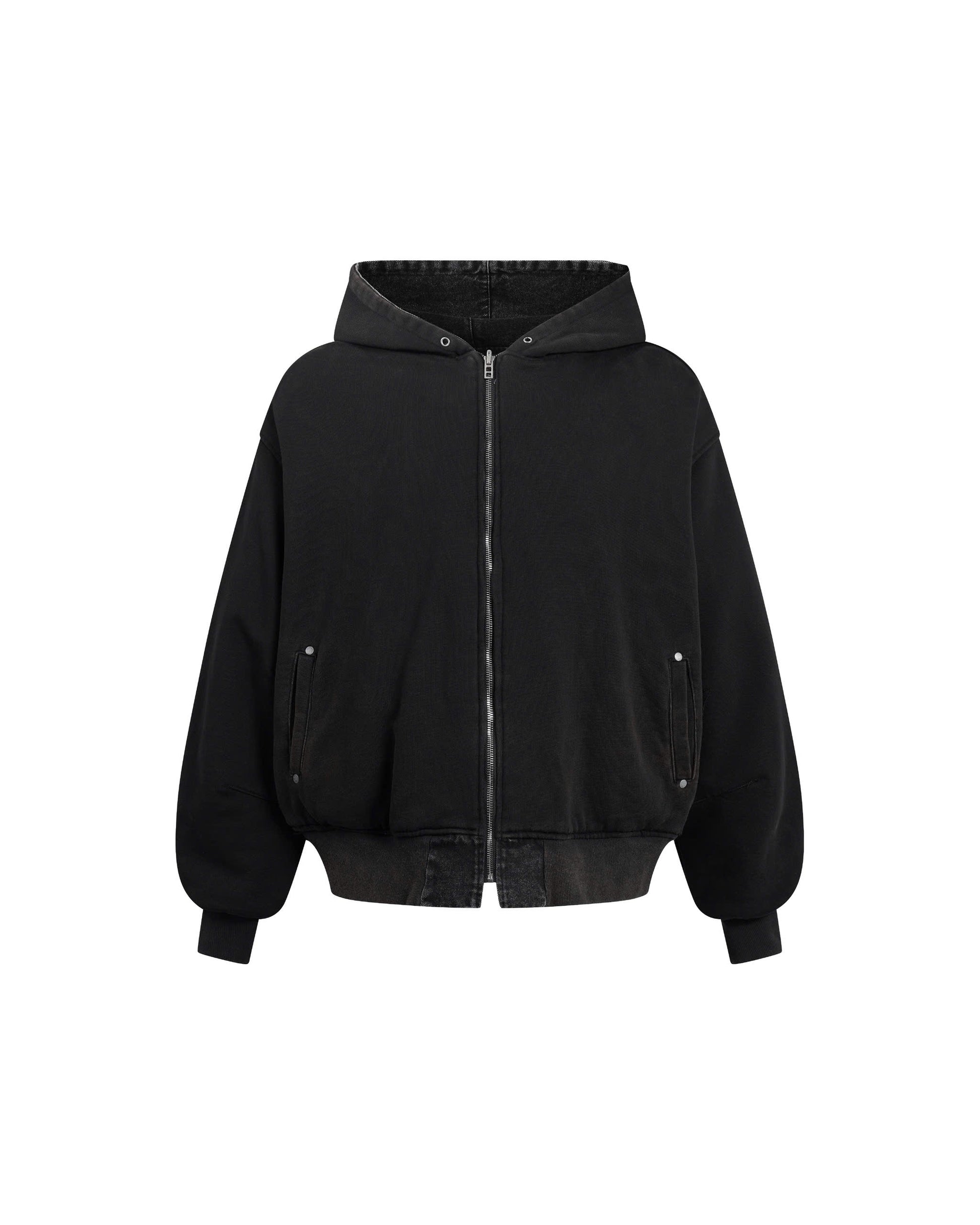 Details: 13.5oz denim & felt cotton textiles / Oxidized wash material treatment / Cropped oversized silhouette / Seamless quilting / Invisible stitch / Multiple rivet & eyelet / Metalwork hardware / YKK zippers