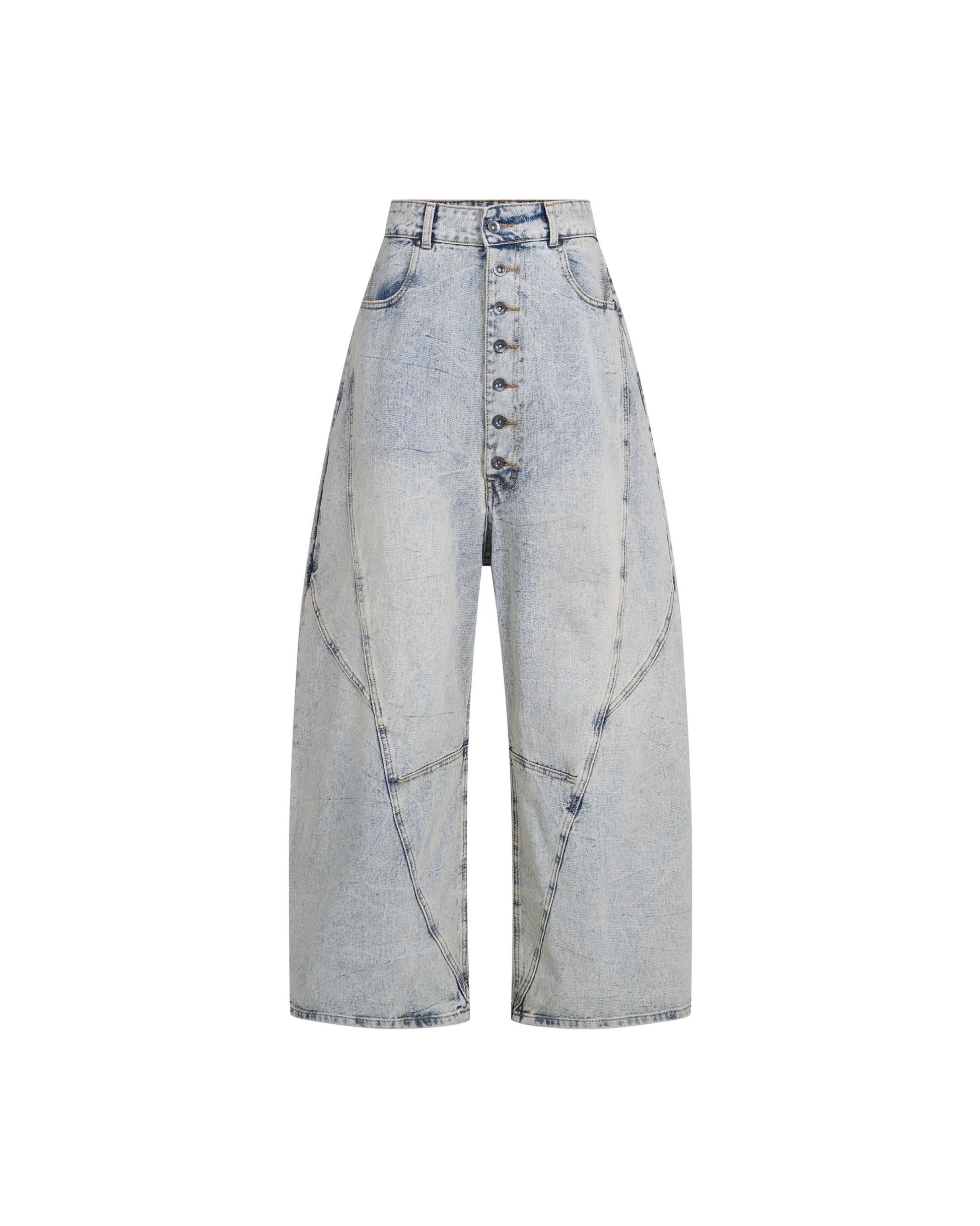 Details: 13.5OZ Denim textiles / Stone washed material treatment / Baggy silhouette / Deconstructed / Buttons fly / Multiple rivets / Metalwork hardwares